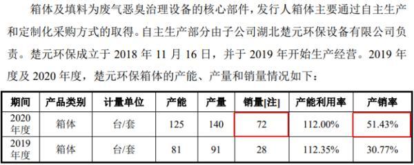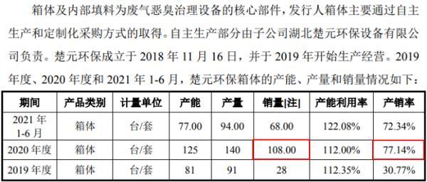 2019年至2021年上半年末,楚元环保箱体的产能分别为81台/套、125台/套、77台/套,产量分别为91台/套、140台/套、94台/套,产能利用率分别达112.35%、112.00%、122.08%,产销率分别为30.77%、77.14%、72.34%。而在发行人申报稿中披露,2020年楚元环保箱体的销量为72套,产销率为51.43%。前后申报内容中2020年度楚元环保的箱体销量相差了36套,产销率相差了25.71%。对此疑点,楚环科技只是回复“以最终在证监会官网发布的招股说明书为准”,并未说明产销率巨幅调整的原因。