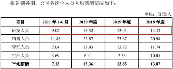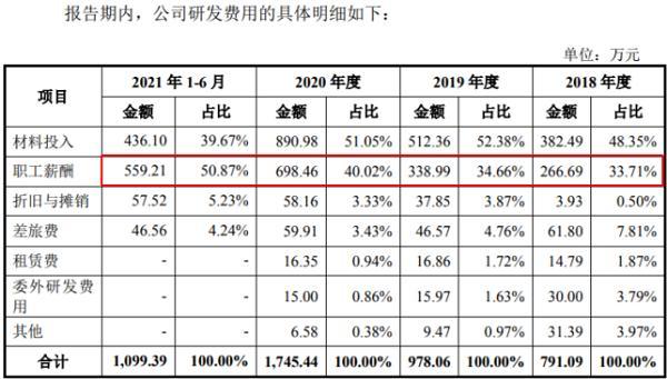 而据申报材料内容,截至2020年末,楚环科技研发人员数量为71人;截至2021年上半年末,研发人员数量达83人。各期分别以平均酬薪15.52万元和9.02万元计算,2020年和2021年上半年末,其研发人员酬薪约应分别为1101.92万元和748.66万元,较所披露研发人员酬薪分别高出403.46万元和189.45万元。