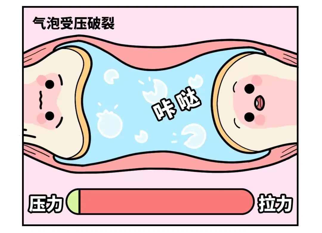 当关节运动时关节腔会瞬间变形处于负压状态,原本溶于液体的气体会气化成气泡,随着关节腔内的压力增大而破裂,我们听到关节“咔”声实际上是关节腔内气泡破裂的声音。