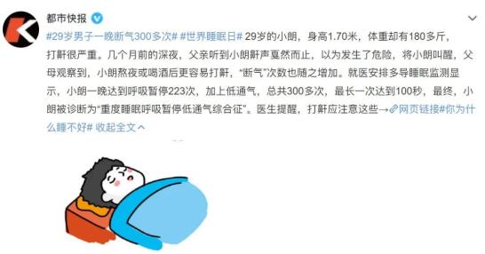 (图源微博)睡眠呼吸暂停综合征指的是睡眠状态下反复出现低通气和(或)呼吸中断,引起间歇性低氧血症伴高碳酸血症以及睡眠结构紊乱,从而导致一系列症状的临床综合征,通常表现为晨起头痛,日间嗜睡,睡眠中打鼾、窒息、倒吸气等。