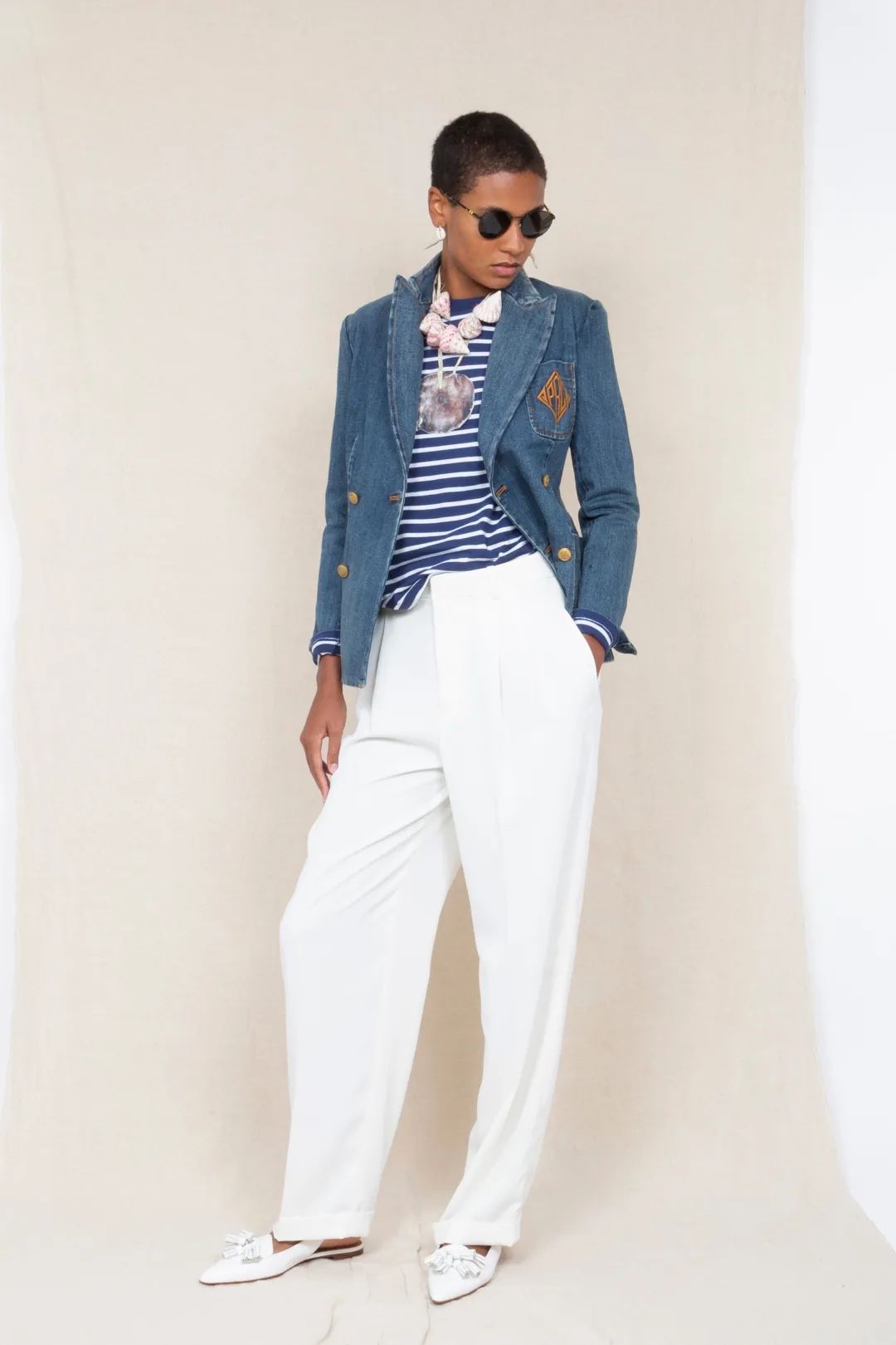 但和白裤子的组合才是最清新的,简单的加入项链、腰带等配饰点缀,就能时髦出街~