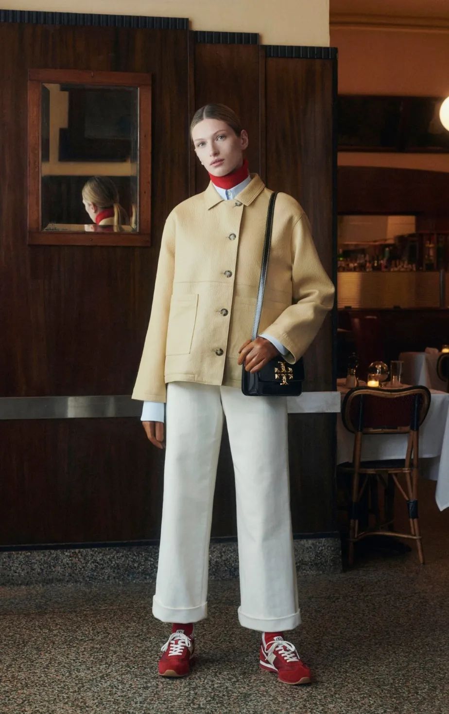 直筒裤修身不紧身的版型,让身体有自由舒展的空间,十分遮肉显瘦。而且硬挺的面料在视觉上,有利于形成纤细的线条感,从而让身材显得更好。