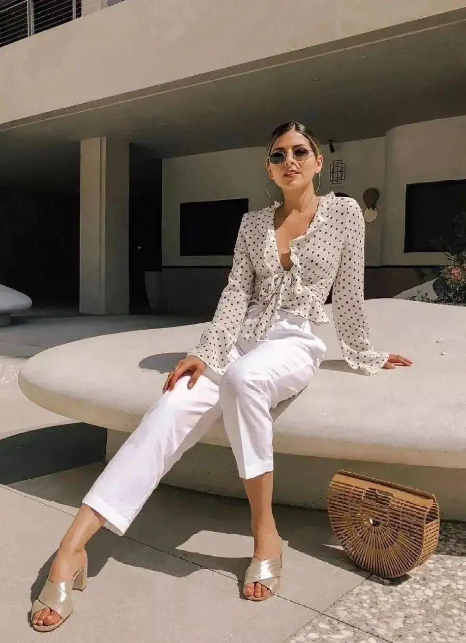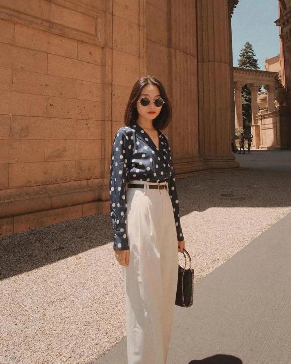 衬衫还是波点最出众,无论黑、白,都透着一股低调、优雅,和简单的小白裤搭配就很时髦!