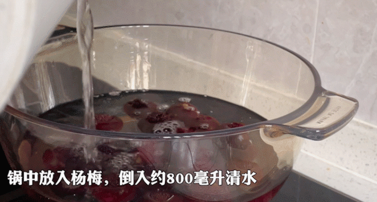 3. 锅中放入杨梅,倒入800毫升水,加冰糖
