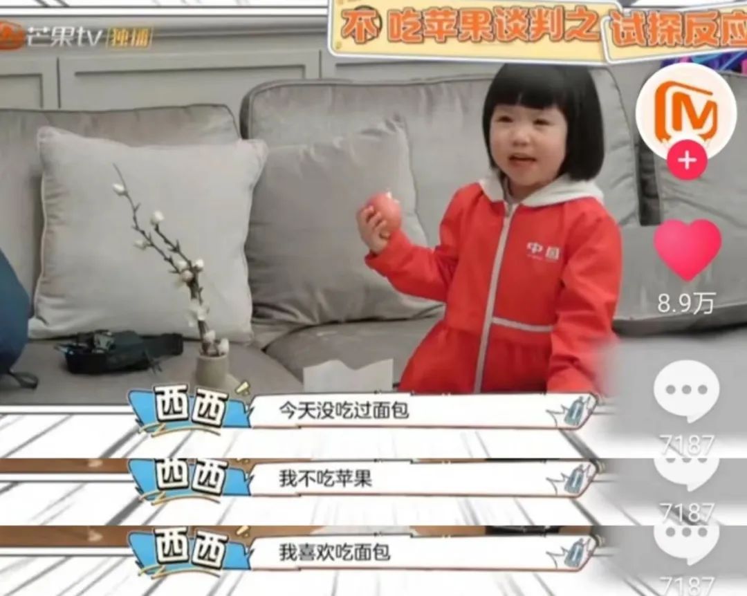 结果苹果还没吃两口,西西觉得苹果又硬又难啃,立马想起来今天还没吃面包,转头又跟张效诚要面包吃。