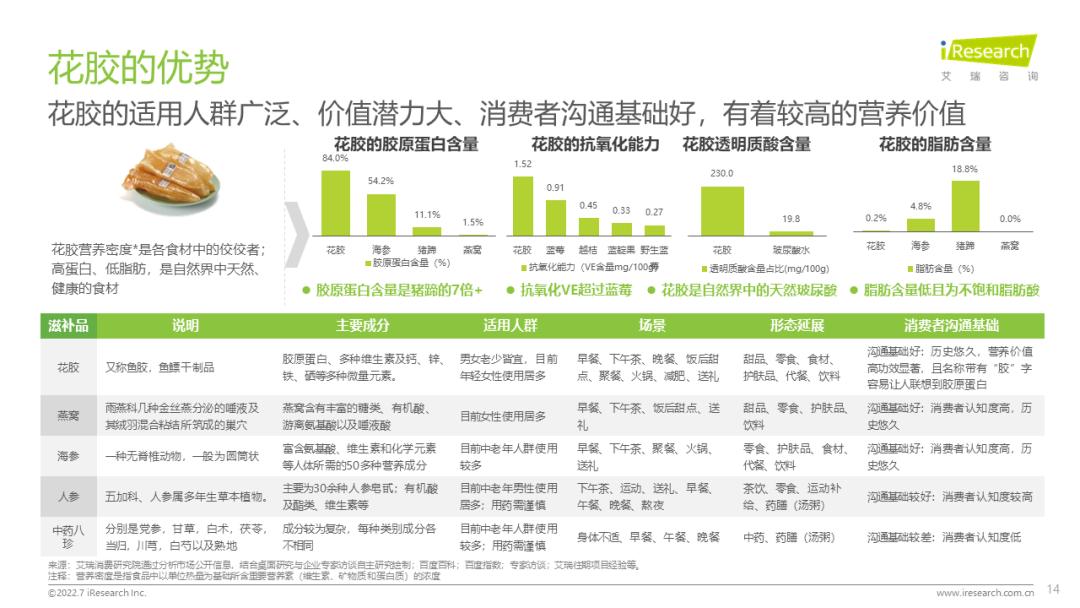 花胶的适用人群广泛、价值潜力大、消费者沟通基础好,有着较高的营养价值