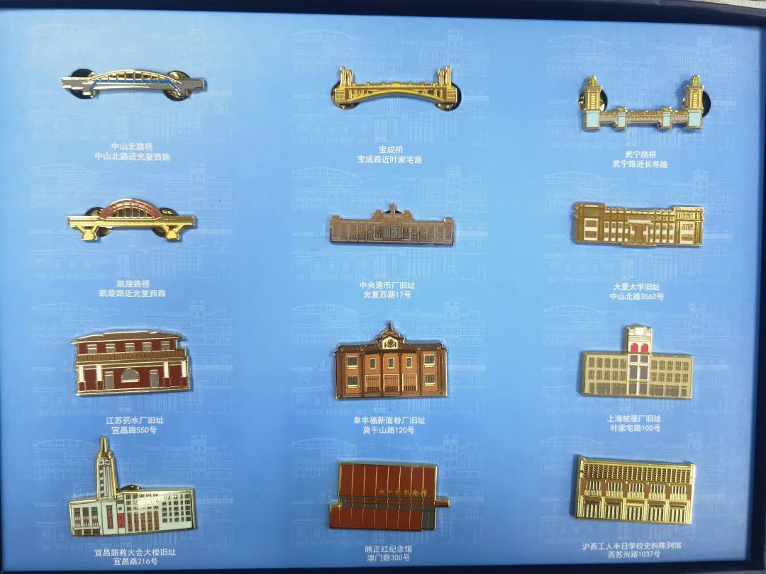 此外,由普陀区文旅局捐赠的“苏河徽章”系列徽章也深受观众的喜爱。据介绍,该套系列徽章结合普陀区“赤色沪西”红色文化基因,汲取普陀区内顾正红纪念馆、沪西工人半日学校史料陈列馆等红色点位的建筑特点,由普陀区文旅局和专业设计团队联合设计推出。以苏州河畔各式建筑作为设计灵感来源,将中央造币厂旧址、江苏药水厂旧址、创享塔园区、阜丰福兴面粉厂旧址等一系列民族工业典型的老厂房建筑,以及宝成桥、中山北路桥、武宁路桥、凯旋路桥等地标性建筑,镌刻在方寸徽章中,呈现出独特的现代审美和普陀的文化底蕴。