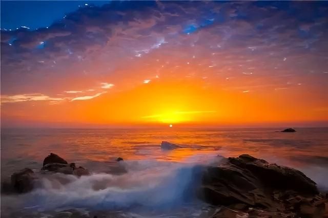 大海、日出、日落就是浪漫的名词,一个人安静地坐在礁石上、沙滩上,看着来往的人,看沙滩的碎石,看着太阳从光明一点点变成橘子色,染红整个沙滩,晒在波光粼粼的海面上,这也不失一种浪漫。