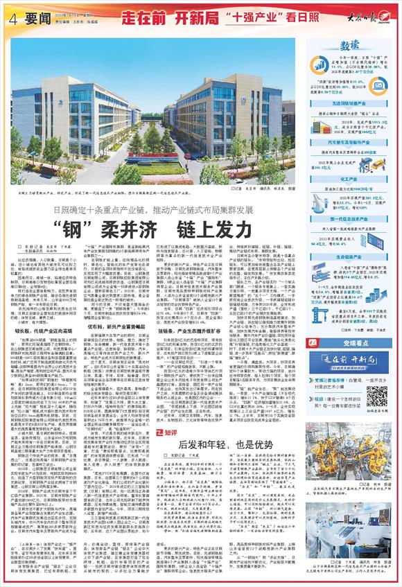 加快日照先进钢铁制造基地建设,加大产业链、供应链以商招商力度提升钢铁产业核心竞争力;充分释放汽车整车产能,加快发展汽车金融、维修保养等后市场服务,提升汽车产业价值链;深挖用好省级化工园区平台资源,围绕“油头化身高化尾”补链强链,打造高端化工产业基地……时下,日照十大产业链正加快补链、延链、强链,进一步筑牢“压舱石”、拼抢“新赛道”、做强“增长点”。