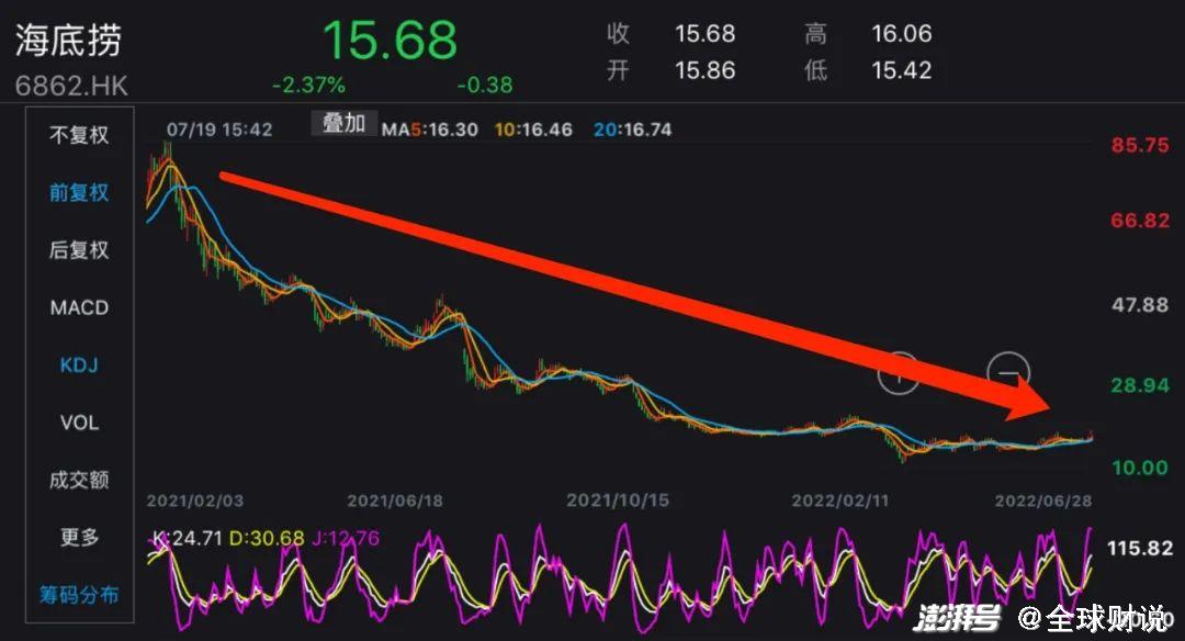 自2021年2月登上86.75港元/股的高点后,海底捞股价就开始一路下滑,惨遭“脚踝斩”。