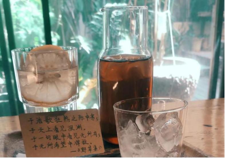 有大象书店的“翠湖鸟瞰图”要找到大象书店需要费一番功夫,这里原来是地下车库,后来被改造成了书店。现在乍一看倒更像一个耄耋夫妇的养老之家,院子边还摆着上世纪80年代生锈了的老永久单车。院子里高高低低地长着许多绿萝、仙人掌和芭蕉树,像是没有人精心打理,又或者就是想让这些植物肆意生长。向书店里望去,能看见暖黄灯光下一排排的书,书架边桌子上有零星几人,有人在看书,有人在聊天。门口展板上写着“夏日限定,童叟无欺,一杯入魂特调——‘冰滴鲁迅’(35元)”。吧台内有两个人在做咖啡,边做边捣鼓着咖啡豆子。