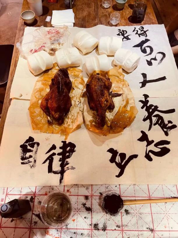 下面这部书法作品的灵感来源于大象书店负责人和达,他对着下面这幅作品说道:“书法的奥义其实就藏在鸡胸肉里,一横一竖,一撇一捺,就要写的像鸡胸撕下的肉一样,横平竖直看似寡淡无味,实则美味无比。”