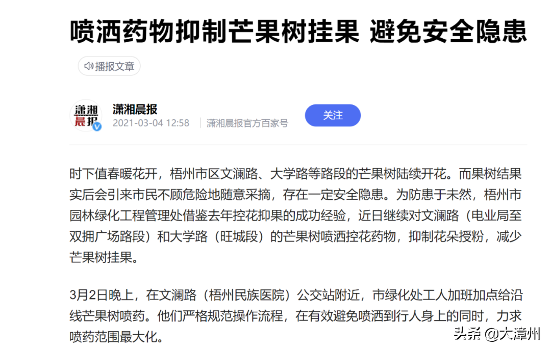 关于这个问题,漳州风景园林中心绿化科相关负责人表示,漳州曾尝试过喷药控果,包括芒果、盆架子的控花控果,但实际操作起来有点难度。因为目前通过生长素调节控花都要在一个特定的时间内,但是每一株树,甚至每一根枝条开花的时间点都不一样,所以统一喷洒药物这个方案理论上可行,操作起来成功率不高。