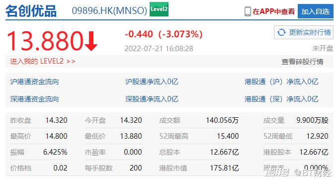 截至7月22日,名创优品港股股价报收13.88港元,港股总市值定格在175.81亿港元,仍处在下行通道。