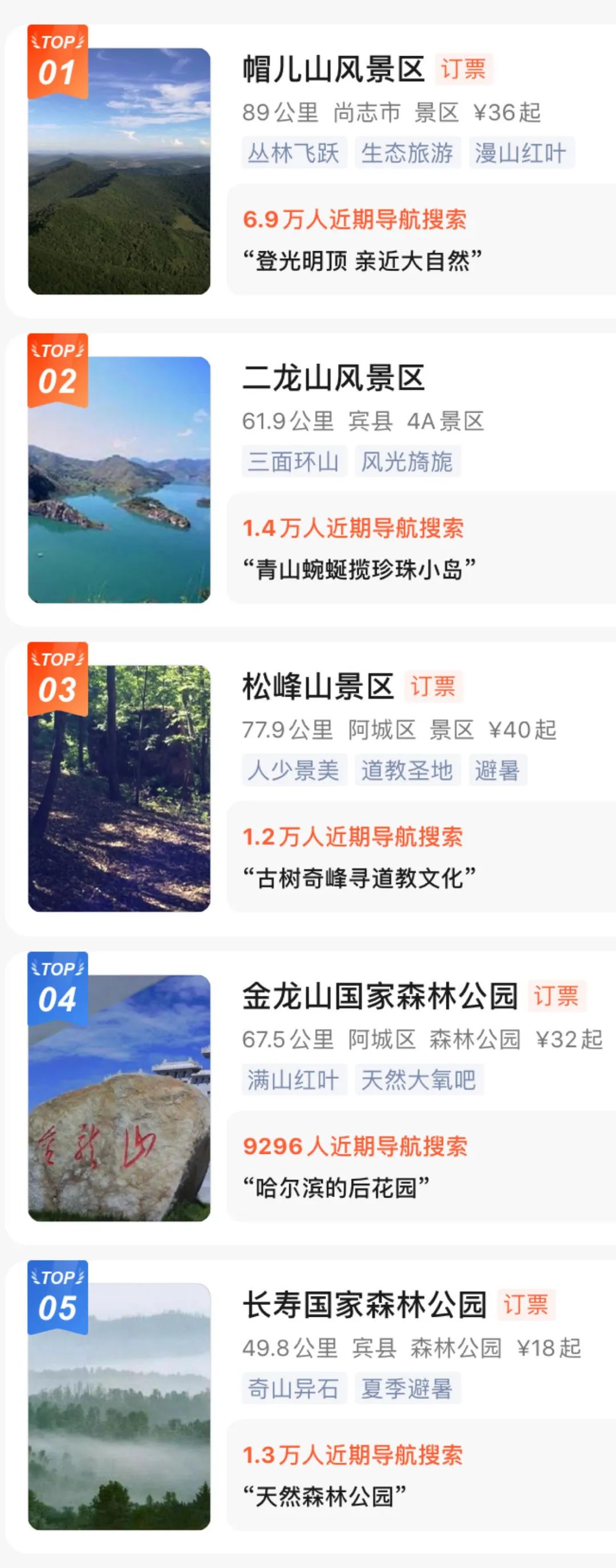 数据显示,“近郊自驾”热门景区TOP5分别为:帽儿山风景区、二龙山风景区、松峰山风景区、金龙山国家森林公园、长寿国家森林公园。