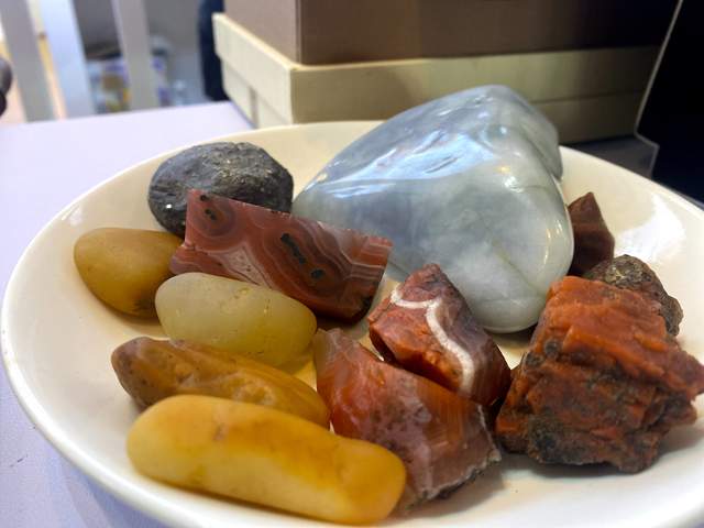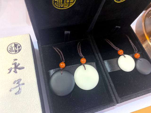保山永子(围棋)第十二代非遗传承人李国伟介绍说:“永子是以保山特有的南红玛瑙、黄龙玉、墨翠等矿石为原料,采用保密配方和绝技熔炼、传统手工点丹而成的围棋子,因这种棋子产于永昌,遂被世人称之为永昌棋和永棋。永子质坚色润、细腻如玉、触子心舒、冬暖夏凉、神韵隽永,是古往今来举世公认的棋中圣品,历来深受文人雅士所追捧,为上乘贡品,堪称国宝。本次交易会,我们还带来了制作永子的原材料料石,以及结合永子工艺的创意产品,例如挂、创意摆件和精美的手工艺首饰。希望来自全国各地的宾朋都能喜欢我们这次带来的展品。”