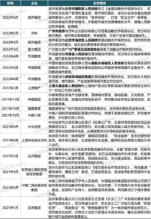 2021年已有部分企业与地方政府达成战略合作关系,如远洋集团与重庆江北区、长沙天心区政府,中建集团与济南政府等。2022年初以来,各地政府大力推动城市更新,提出大胆改革创新,纷纷积极探索新模式、新路径,“政企合作”就成为推动城市更新进入快车道,助力城市高质量发展的重要机制。