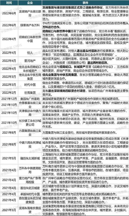 特征六:困境之下,多方合力共同推进城市更新项目。2021年各大房企积极布局城市更新市场,加速城市更新业务扩展,但在住建部严控城市更新“大拆大建”及房地产市场持续下行的影响下,2022年初以来,各大房企纷纷调整策略,民企与国企积极寻求合作,以期发挥各自优势。