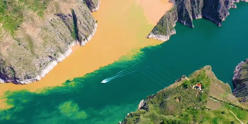 而真正的奇妙之处在于,此处蔚蓝清澈是黄河,而洮河才浑浊不清。看着丹霞山色屹立在蜿蜒曲折的黄色和绿色水带之间,让人不由喟叹“是造物者之无尽藏也”。