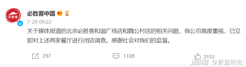 对于此次事件,必胜客官微表示,会对上述两家餐厅进行闭店调查。