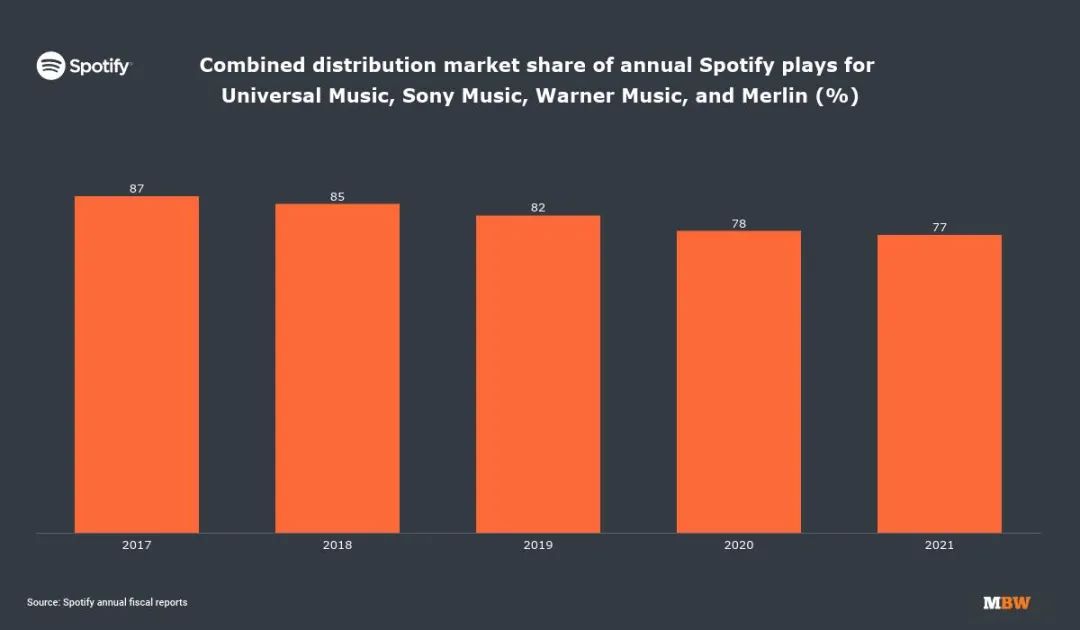 数据显示,2017年,三大唱片公司和Merlin为Spotify贡献了87%的歌曲,到了2022年,这一数值已经下降到77%。也就是说,短短四年间唱片巨头们在Spotify上就损失了10%的市场份额。