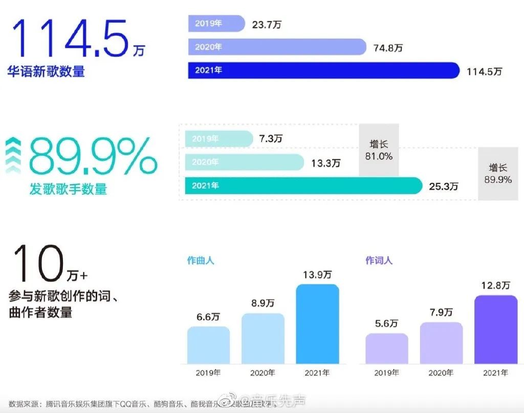 反观国内,《2021华语数字音乐年度白皮书》显示,2021年华语乐坛全年新歌总量达到114.5万,相当于一整年平均27秒就会诞生一首新歌。