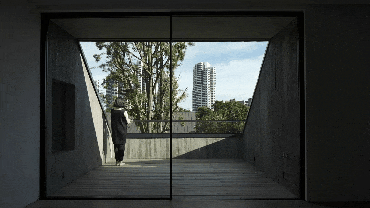 ▲框住小树的采光井内部则是木板纹理的混凝土