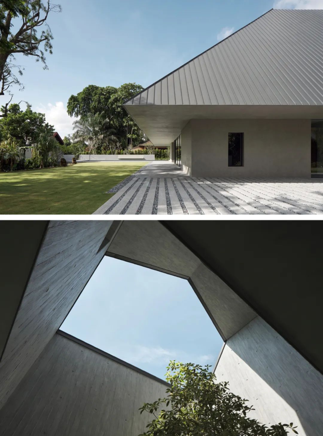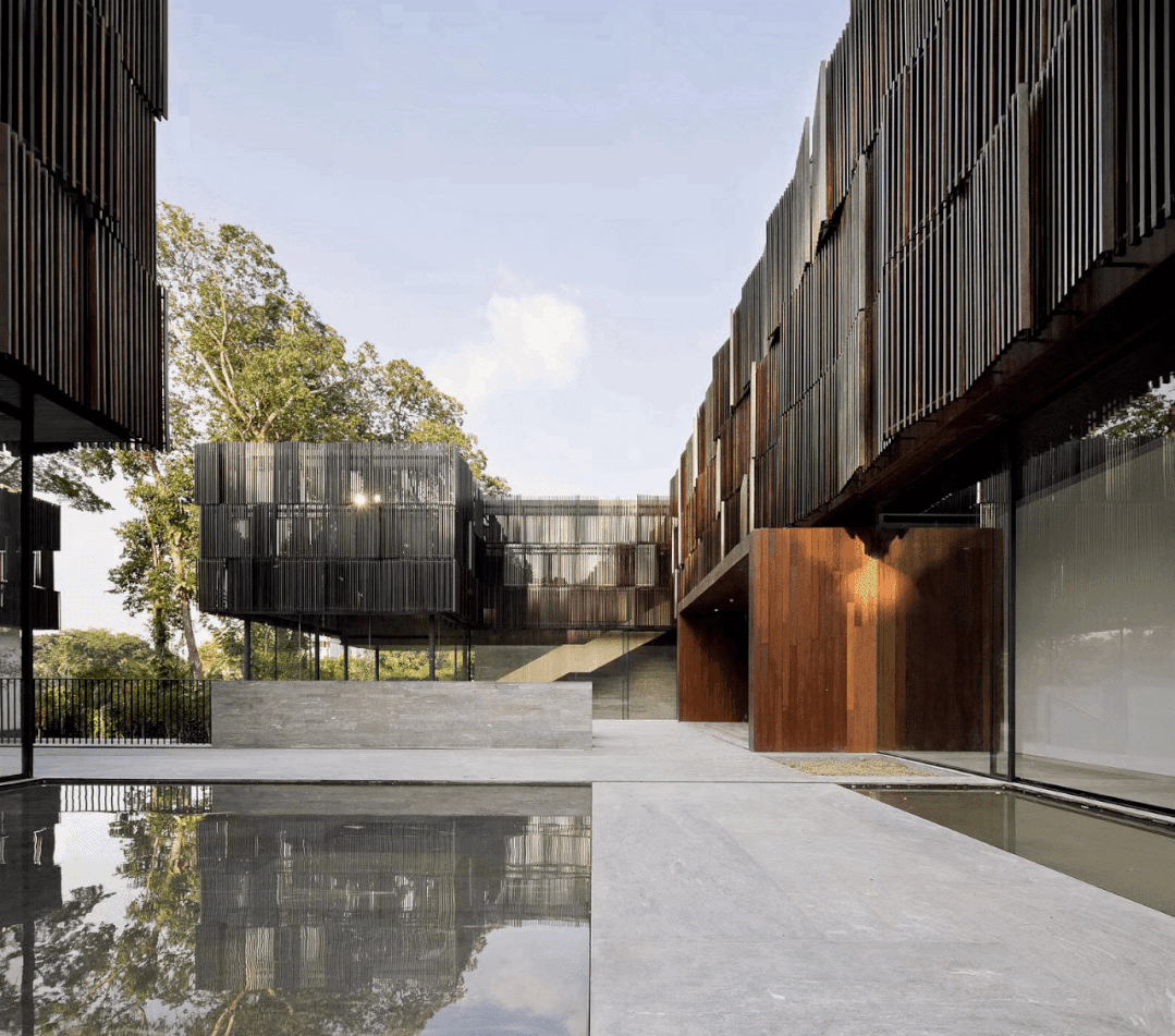 其实早在2012年,郭锡恩和胡如珊就在新加坡另一处有13间卧室的华裔私人住宅里,化用过四合院的形态,将传统的“回”字型宅院演化为两个L形体块。并且同样使用了透明玻璃外墙、双层挑高空间等来处理室内与室外、庭院和房子、私人空间和公共空间的关系问题。
