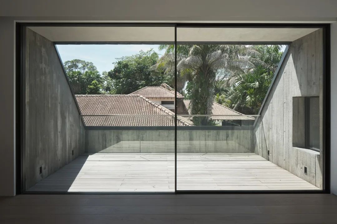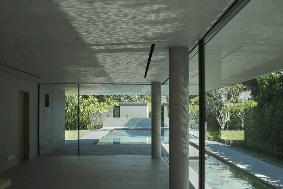 新加坡位于热带,房屋通风很重要。所以通透的另一个好处,就是随时能打开玻璃门通风。室内与屋外相互连接,进出无碍的不止是风,泳池和花草树木看上去也延伸到了室内,触手可及。