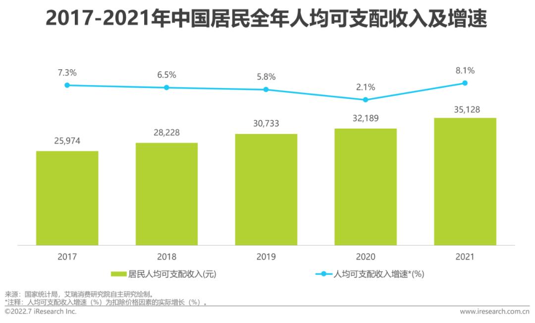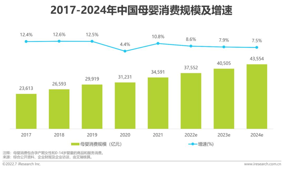 2017-2021年,我国居民人均可支配收入持续提升,2020年虽受疫情影响增速减缓,但2021年反弹至8.1%,已超疫情前水平。母婴消费规模未受出生率下滑影响,近年来稳步增长,2021年达34591亿元,预计2023年将突破4万亿元大关。