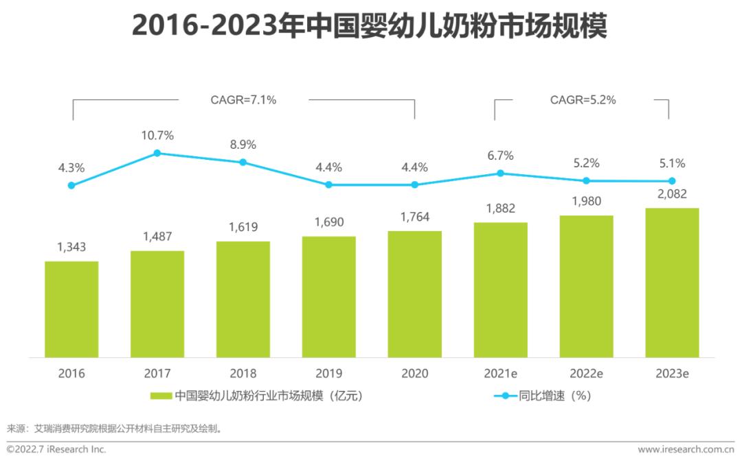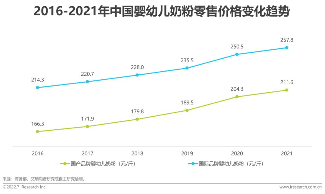 婴幼儿奶粉市场规模保持增长态势,产品高端化趋势明显随着居民可支配收入和母婴消费规模的持续提升,近年来婴幼儿奶粉市场规模稳步增长,预计2023年将突破2000亿元。根据国家商务部数据,国产、国际品牌的婴幼儿奶粉零售价格持续增长,高端化趋势明显,整体发展势头向好。