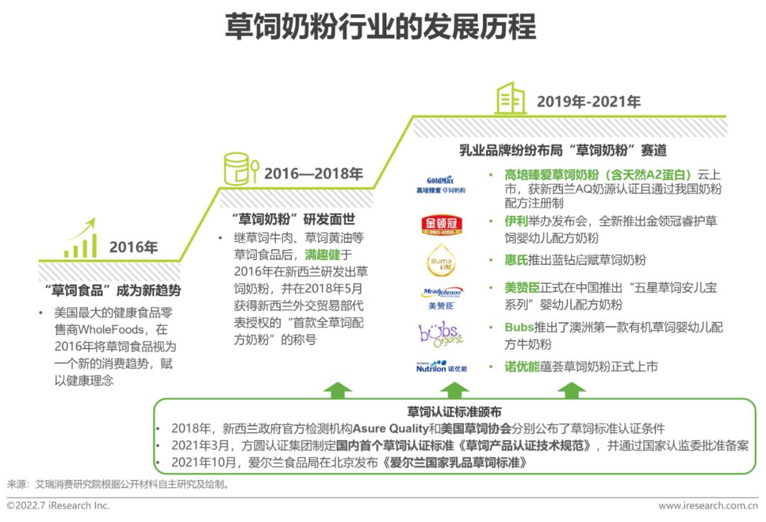草饲奶粉行业发展历程草饲奶粉行业尚处起步阶段,草饲认证标准颁布、知名乳企入局促进行业发展