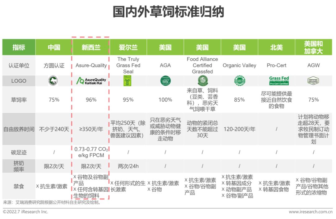 草饲牛奶的营养优势分析-认证标准新西兰AQ认证具有最严格的草饲认证标准,要求在奶牛草饲率超过96%的同时,全年自由放养时间超过350天