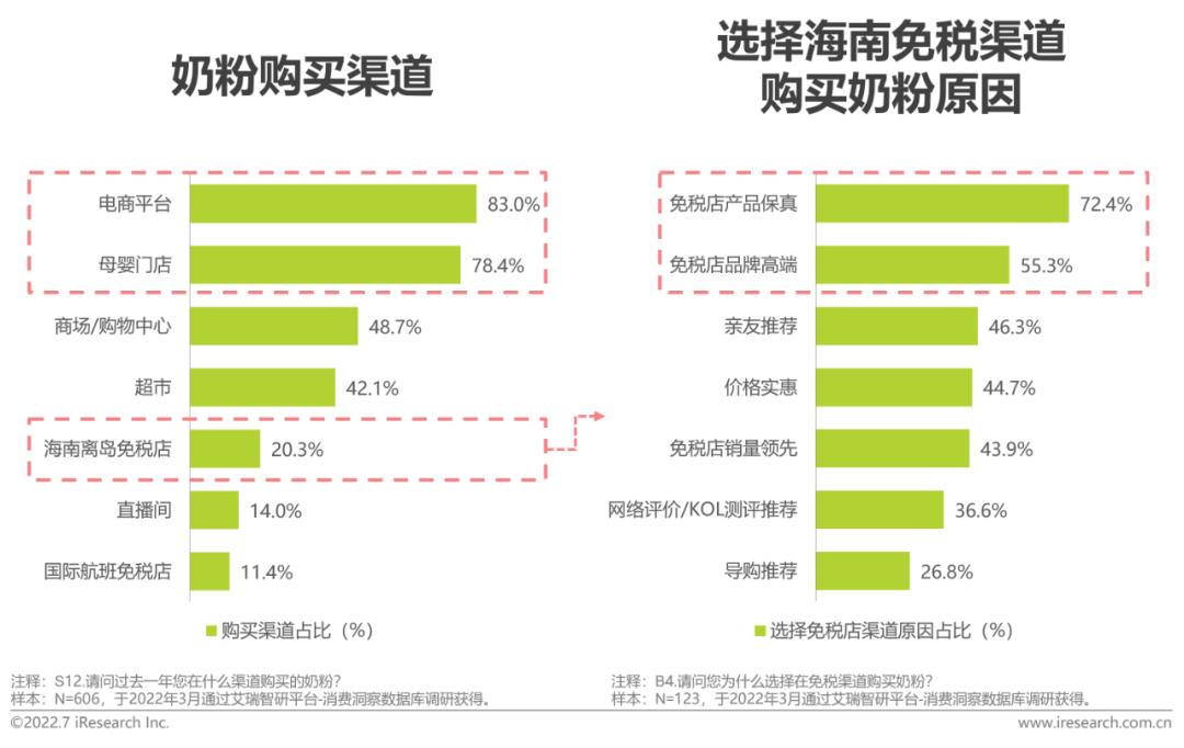 电商平台和母婴门店是消费者首选的奶粉购买渠道。疫情后国际航班数量下降,国际离境免税店生意受阻,海南离岛免税店受到消费者青睐,20.3%的消费者选择通过海南免税渠道购买奶粉。消费者选择免税渠道的原因中价格实惠因素仅排名第四,更多消费者选择免税渠道看重其售卖的奶粉产品保真且品牌高端。