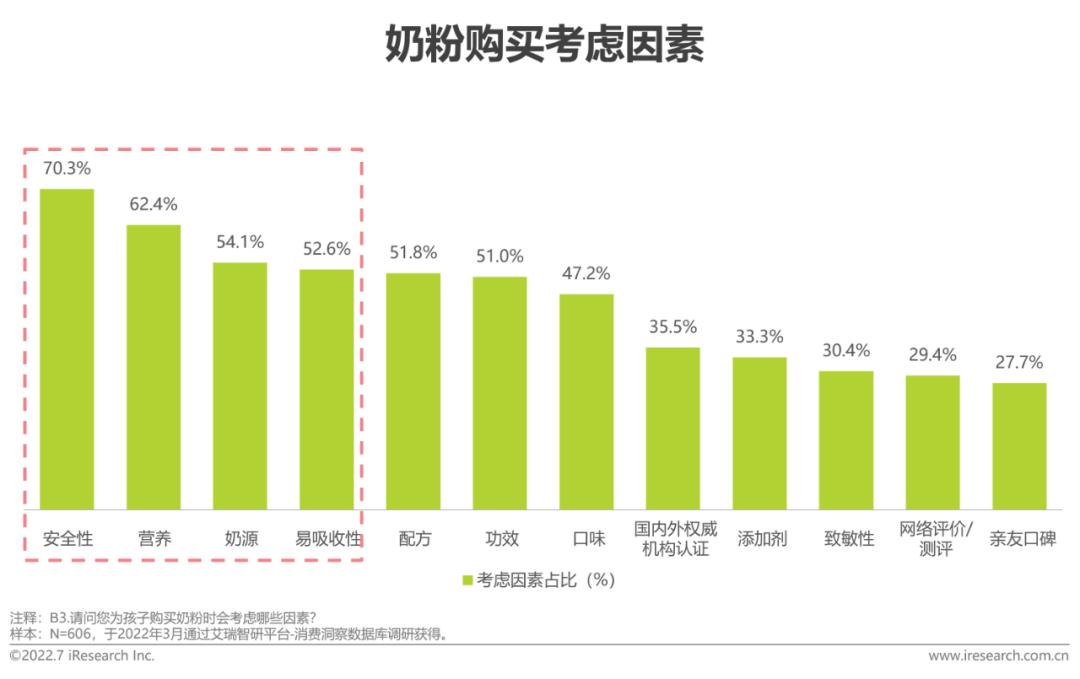 草饲奶粉消费者需求与行为洞察:安全、营养、奶源和易吸收是消费者购买奶粉时主要考虑的因素,而消费者选择购买草饲奶粉正是因为草饲奶粉奶源天然原生态,无添加剂、0激素、0催乳,孩子消化更易吸收以及产品更安全的特点,与消费者需求相契合,产品优势逐渐显现。