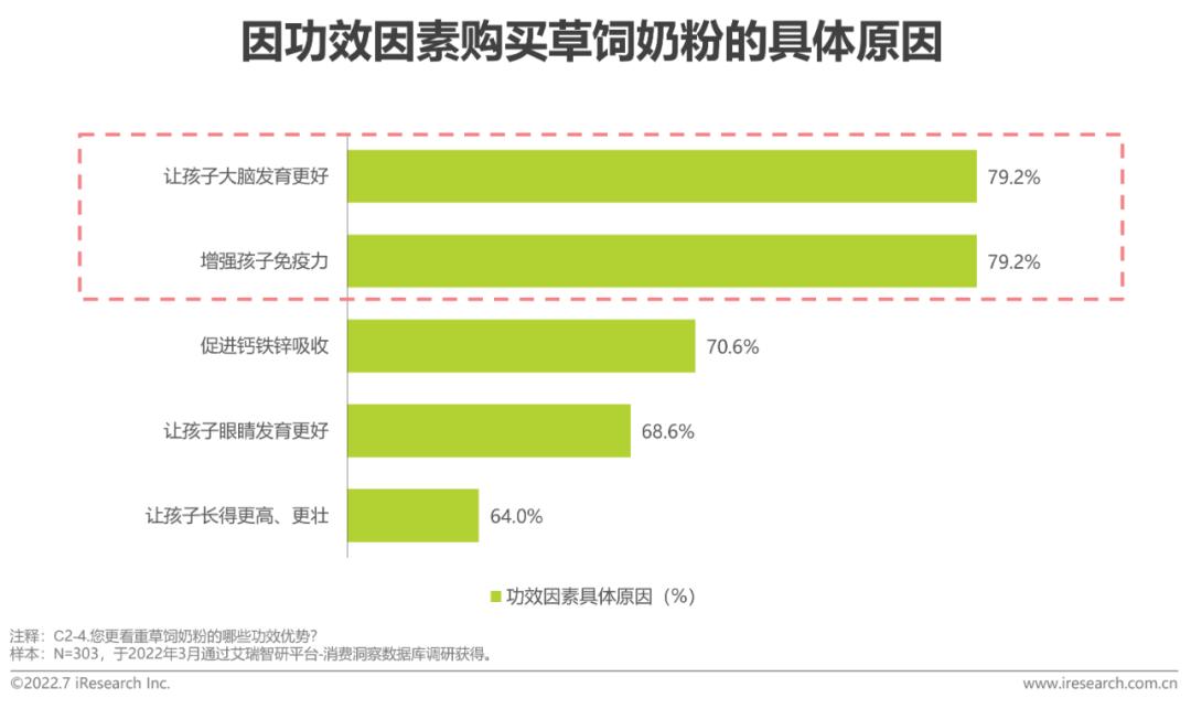 购买草饲奶粉的原因-营养、功效消费者因草饲奶粉天然营养素含量更高和含有原生优质蛋白而选择购买;功效方面,消费者更看重草饲奶粉在促进大脑发育和增强免疫力方面的优势。