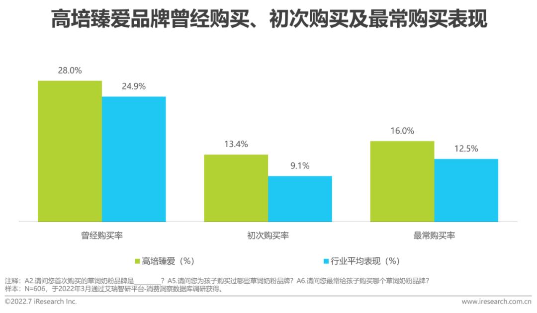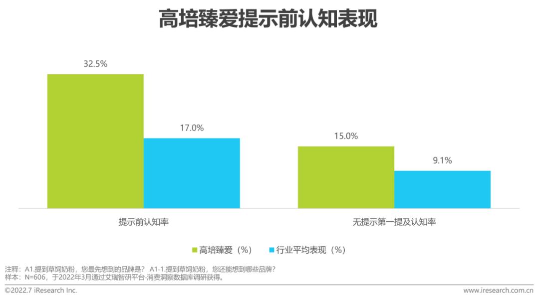 无提示认知指消费者在无提示条件下自由联想草饲奶粉品牌的提及情况,体现了消费者心智中品牌的占有程度。高培臻爱的无提示第一提及认知率和提示前总认知率表现分别均优于行业平均5.9%和15.5%,处于行业领先水平。