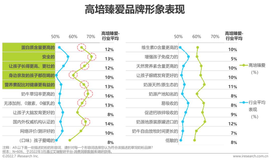 高培臻爱品牌形象表现高培臻爱各形象表现均高于行业平均,且在Top 5购买驱动核心形象上领先行业均值10%以上,在消费者心智中占据了较强的购买驱动形象积累。此外,高培臻爱在“奶牛草饲率更高的”、“无添加剂”、“国内权威机构认证的”等形象上同样处于行业领先水平,在消费者心智中占有天然原生态方面的形象优势。