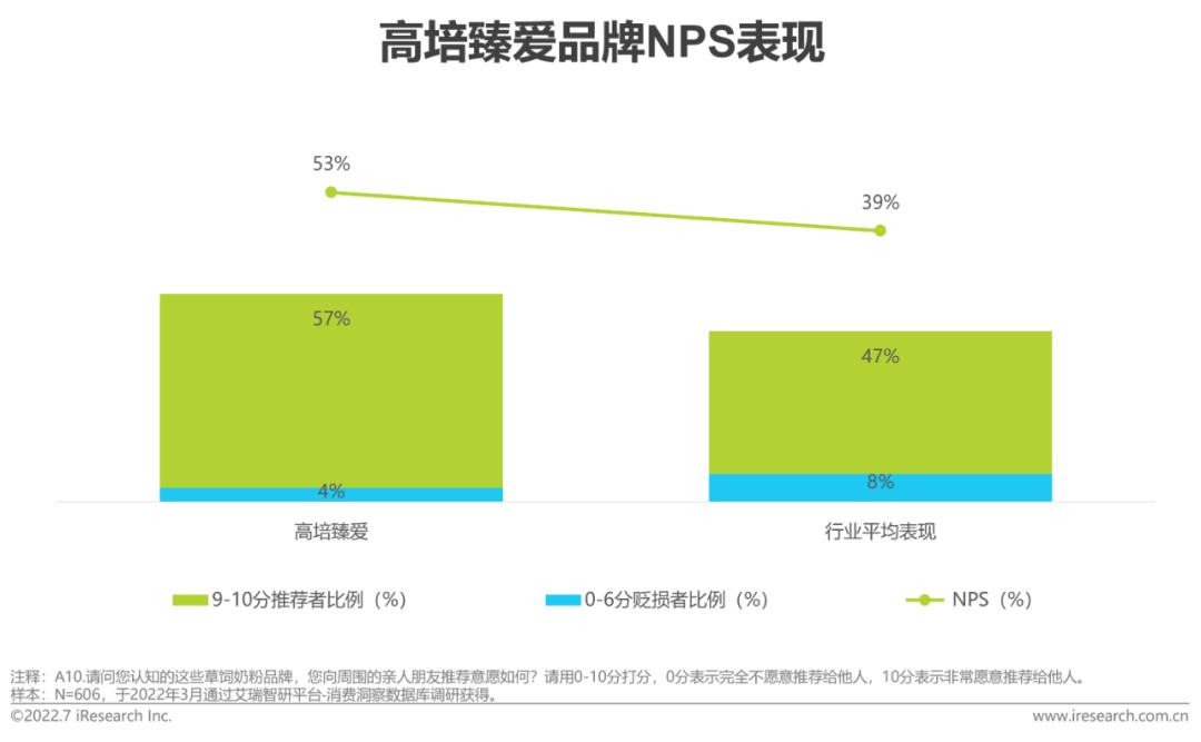 高培臻爱品牌NPS净推荐值表现高培臻爱的净推荐值53%,具体来看,推荐者比例57%,高于行业10%,贬损者比例4%,低于行业4%,消费者推荐意愿处于行业领先地位。