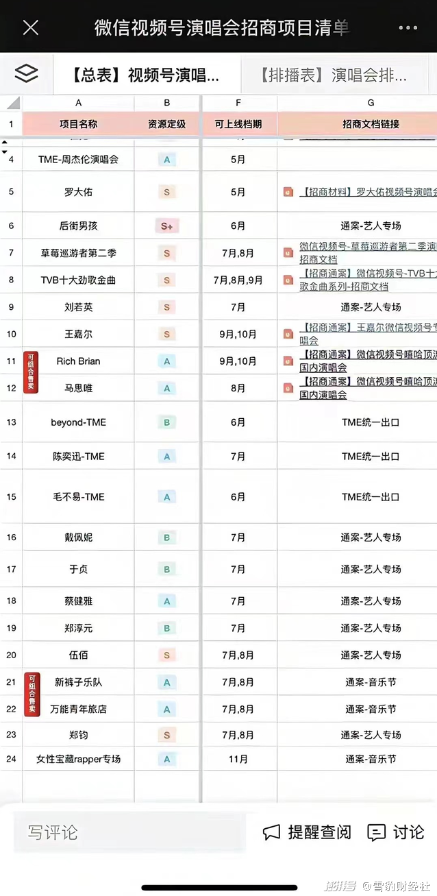 一份流传甚广的视频号演唱会招商项目清单显示,视频号的演唱会排期已经排到了年底,待出场歌手不仅包括刘若英、陈奕迅、蔡健雅等“狙击”情怀的歌手,也开始覆盖王嘉尔等年轻一派的歌手。