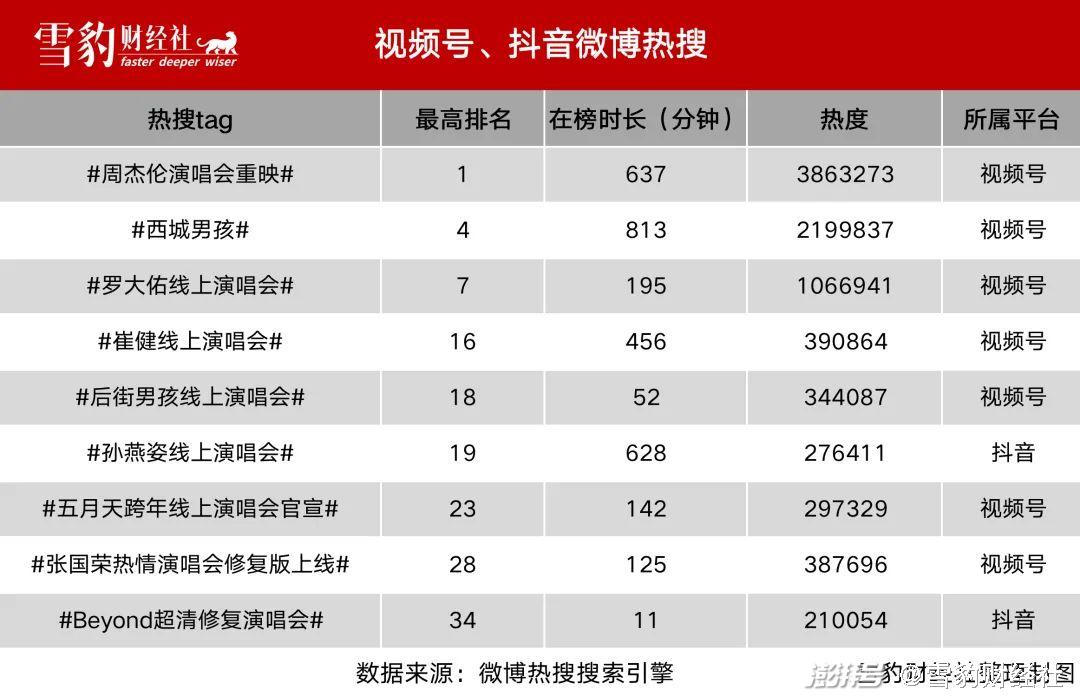 从微博热搜来看,二者演唱会的声量也差距明显。同一天上线的罗大佑线上演唱会,在微博热搜上在榜195分钟,最高排名位列热搜第7,而孙燕姿演唱会最高只排到19名,热度不到罗大佑演唱会热搜的三分之一。纵观二者过去几场演唱会的热搜数据,前五名均被视频号占领。