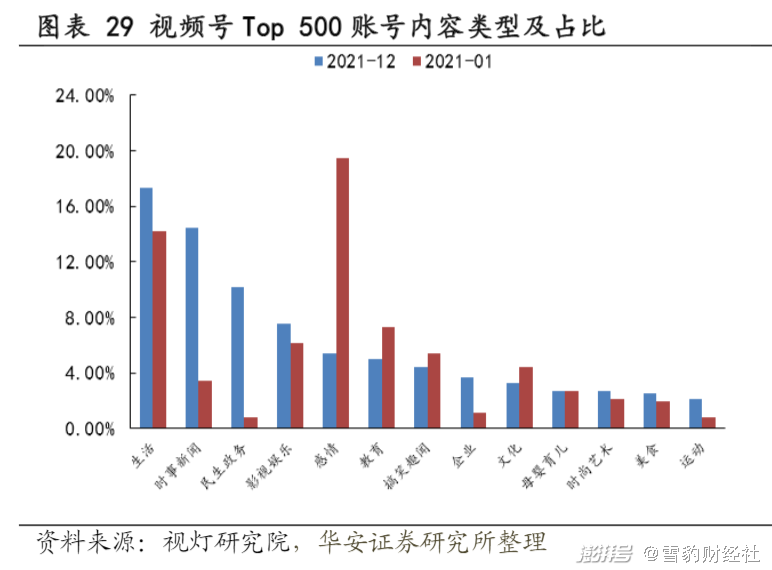 从内容生态来看,相比起抖音生态的多样性,视频号的内容生态原本就略显单薄。华安证券研报显示,视频号TOP 500账号中,时事新闻和民政政务类共占认证账号的49.1%。