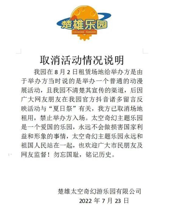 7月23日,楚雄太空奇幻主题乐园发布“取消活动情况说明”:我园在8月2日租赁场地给举办方是由于举办方当时说的是举办一个普通的动漫展活动,且我园不清楚其宣传的渠道,后因广大网友朋友在我园官方抖音诸多留言反映活动与“夏日祭”有关,我方已取消场地租用,禁止举办方入场。