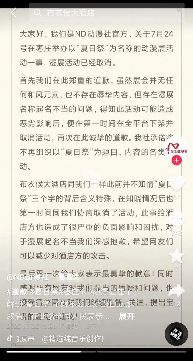 7月24日,原定在山东枣庄布衣侯大酒店举办的“夏日祭”活动取消。酒店表示此前不知活动内容,也不了解“夏日祭”含义。得知含义后和动漫社沟通取消。