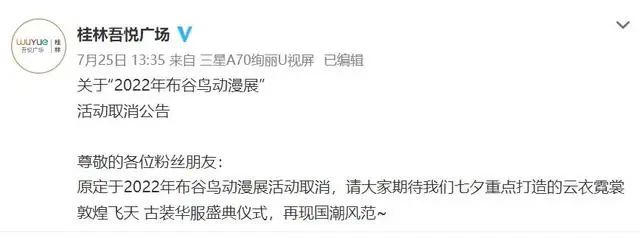 7月25日,桂林吾悦广场官微发布声明,称原定举办的2022年布谷鸟动漫展活动取消。