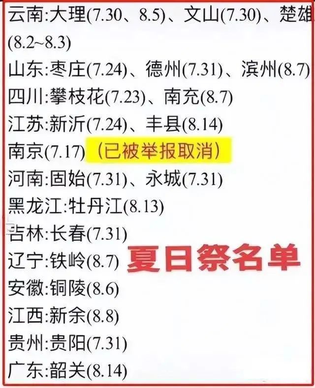 目前,已有江苏南京、江西新余、云南大理、云南楚雄、山东枣庄、广西桂林、广东韶关等多地取消“夏日祭”活动,多地展馆、酒店纷纷发布声明,否认举办“夏日祭”传闻。
