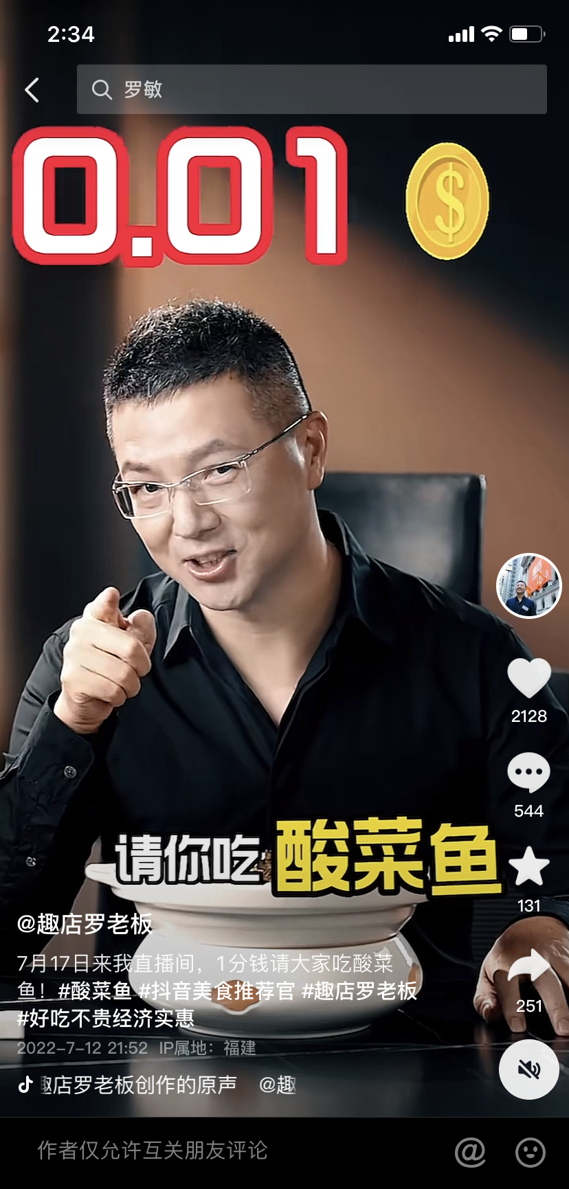 趣店罗老板抖音号10天内掉粉20多万,几十万人薅完1分钱酸菜鱼便不再光顾,花上亿元成本洗不白趣店的过往。