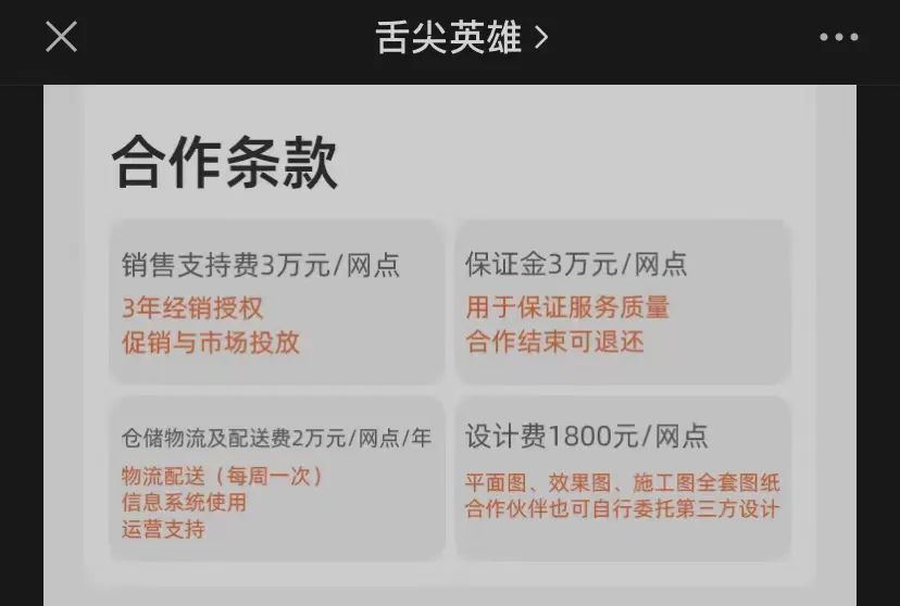 跟舌尖英雄相比,趣店的加盟条件似乎还更加优惠,不收取加盟费和保证金,合作伙伴只需要选好店址,承担房租和装修等费用。