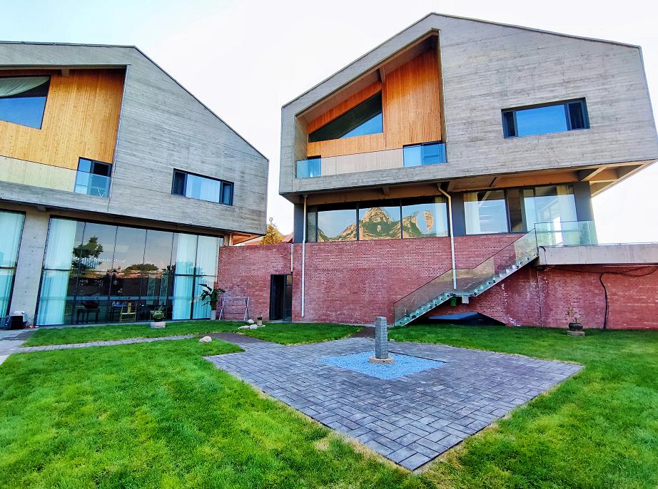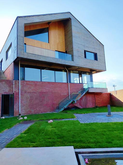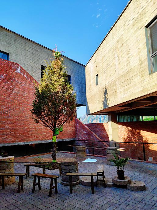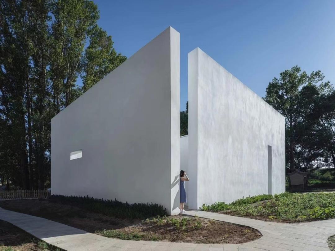三幢超大的几何体建筑成小院,
