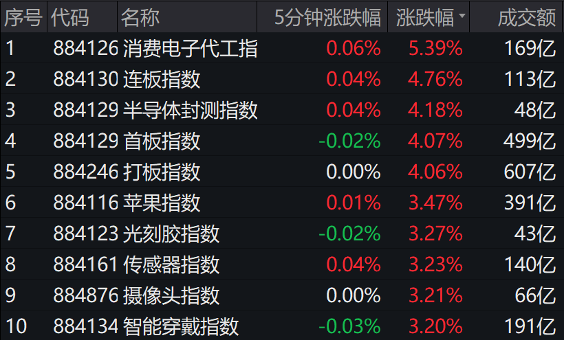概念板块方面,Wind数据显示,7月28日,消费电子代工指数(884126)大涨5.39%,半导体封测指数(884129)涨超4%,苹果指数(884116)、光刻胶指数(884123)等电子相关指数也涨超3%。